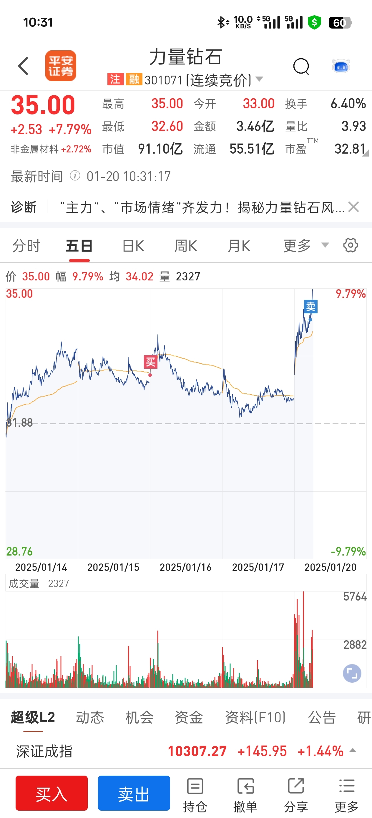 $力量钻石(SZ301071)$ 今天力量不可能在跌回34.3了,因为我34.3卖的,它不会再让我T回来了