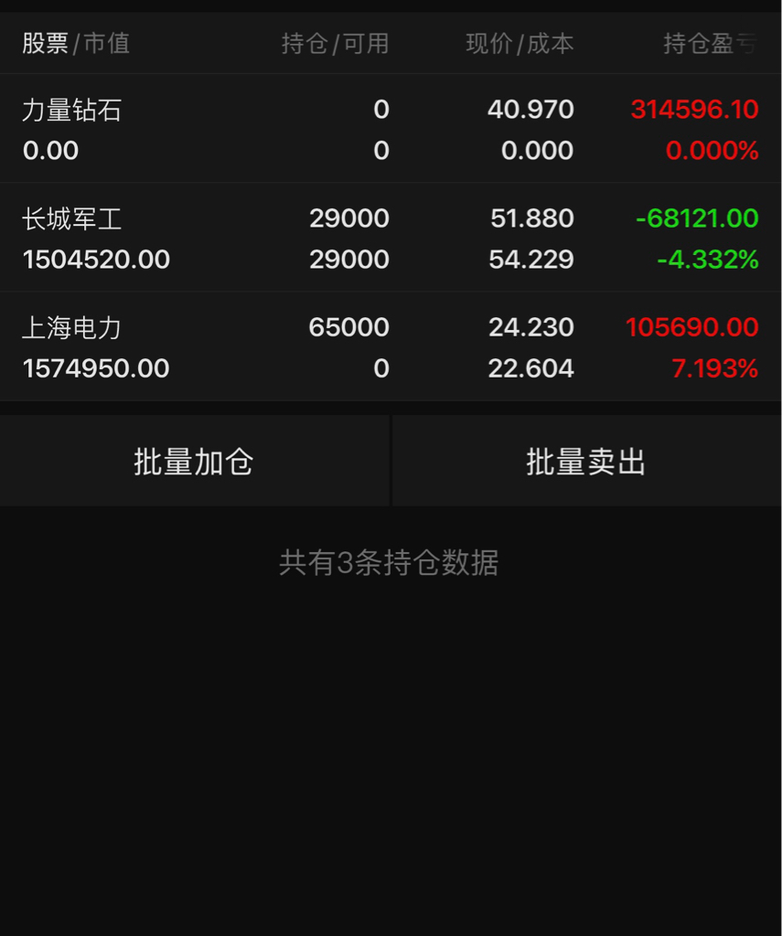 力量钻石落袋为安,继续持仓长城军工等待走强,今日建仓上海电力