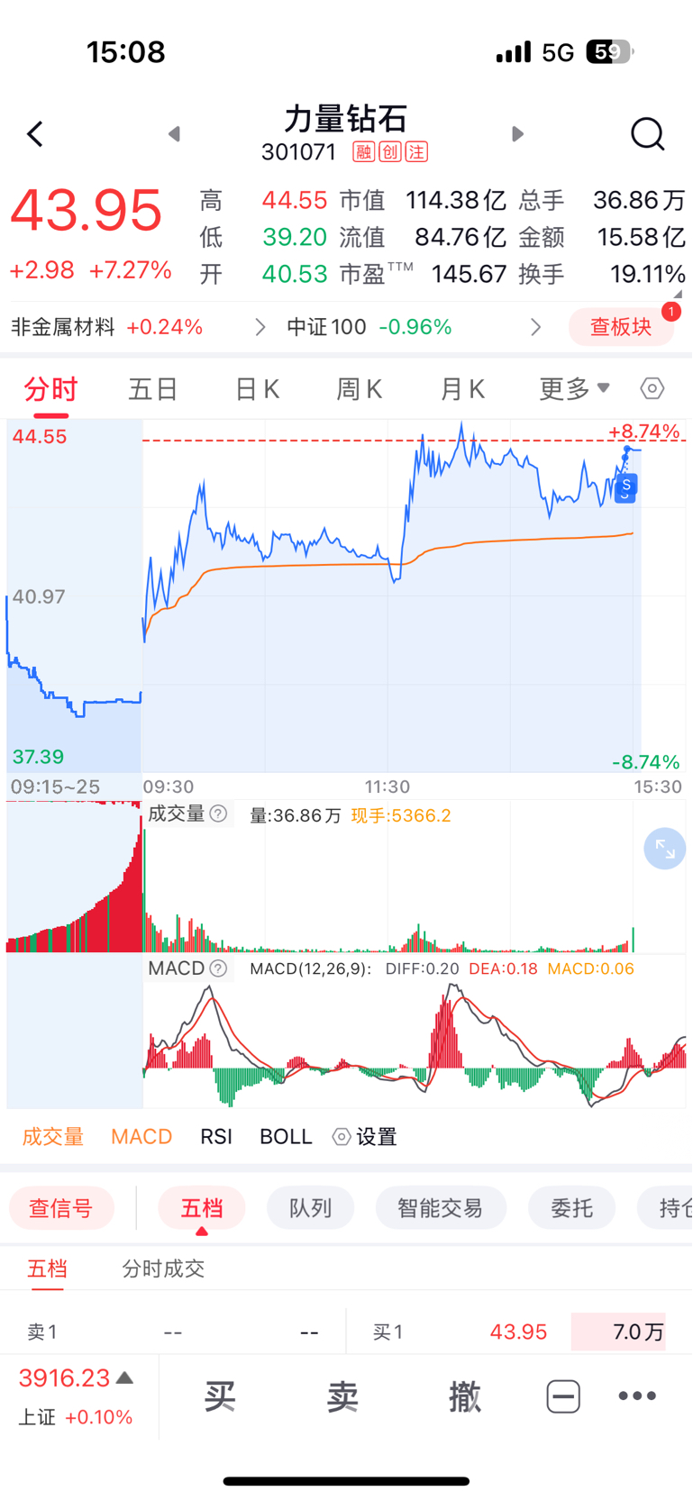 $力量钻石(SZ301071)$ 随着黄河的反包,力量收盘企稳43.31,自然看高一线,考虑到拉尾盘,t了1/3出来做个保险,这个票短线暂时看到65