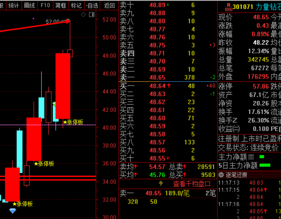 301071上方触及压力展开了回踩下探,主力资金流出中