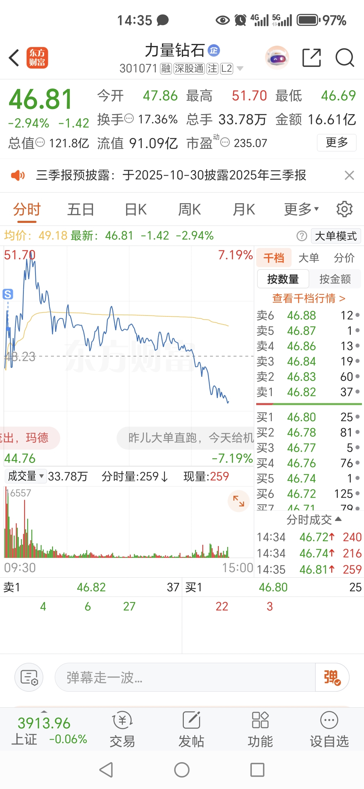 $力量钻石(SZ301071)$ 这货弱爆了,幸好红盘小赚跑了