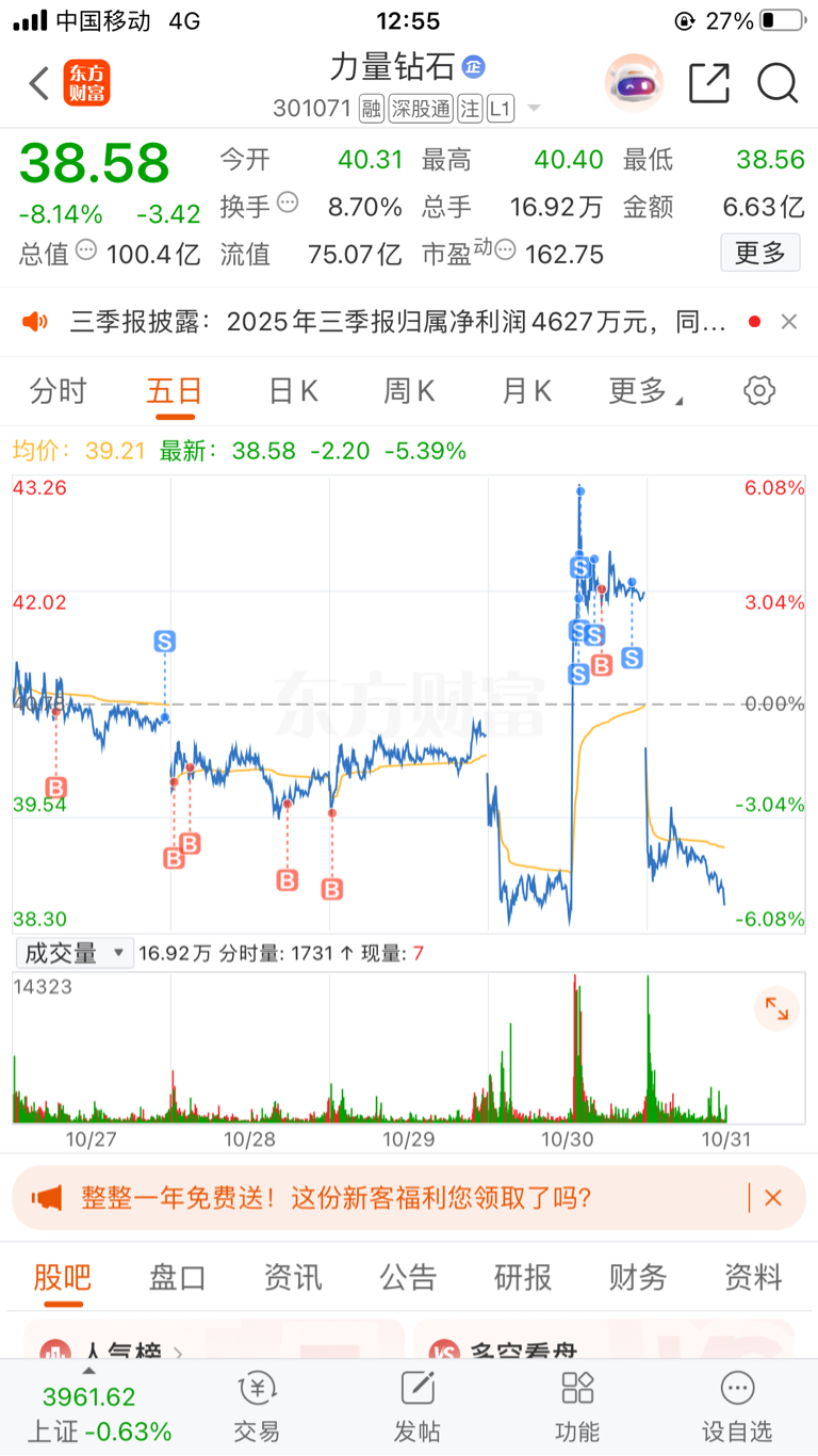$力量钻石(SZ301071)$ 还好跑了,剩下底仓