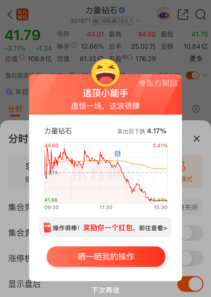 $力量钻石(SZ301071)$ 全天都在震荡,上也不是,下也不是,左眠在跳然后灵机一动横久必跌的理念果断放弃,卖出后突然开闸泄洪减少了大回撤,前天被股吧的小托放利好消息满天飞
