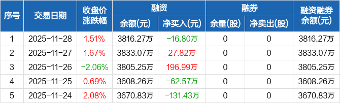 中捷精工:融资净偿还16.8万元,融资余额3816.27万元(11-28)