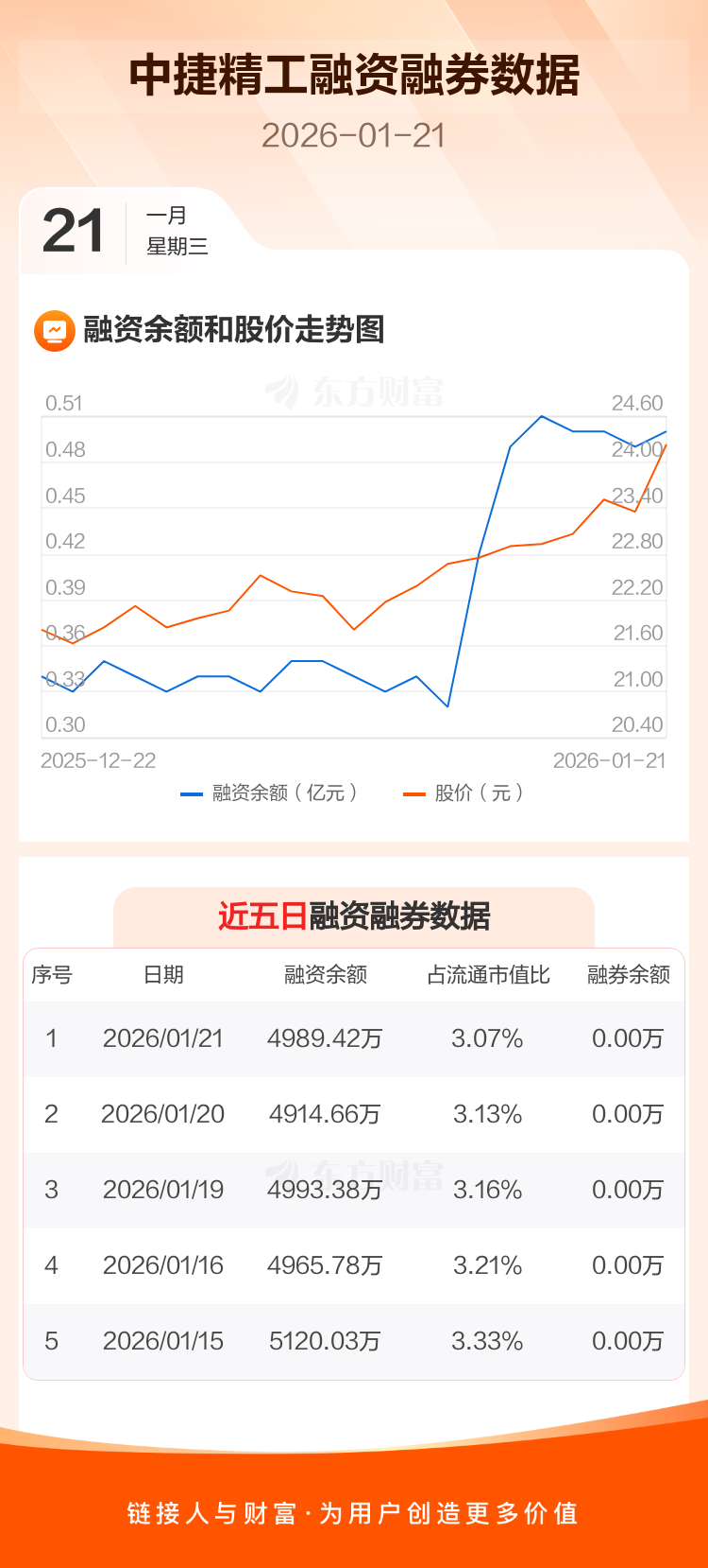 交易所最新数据显示,中捷精工于2026年1月21日获融资买入453.93万元,融资偿还379.17万元,当日融资净买入74.76万元。目前,该股融资余额4989.42万,占流通市值比例为3.07%。