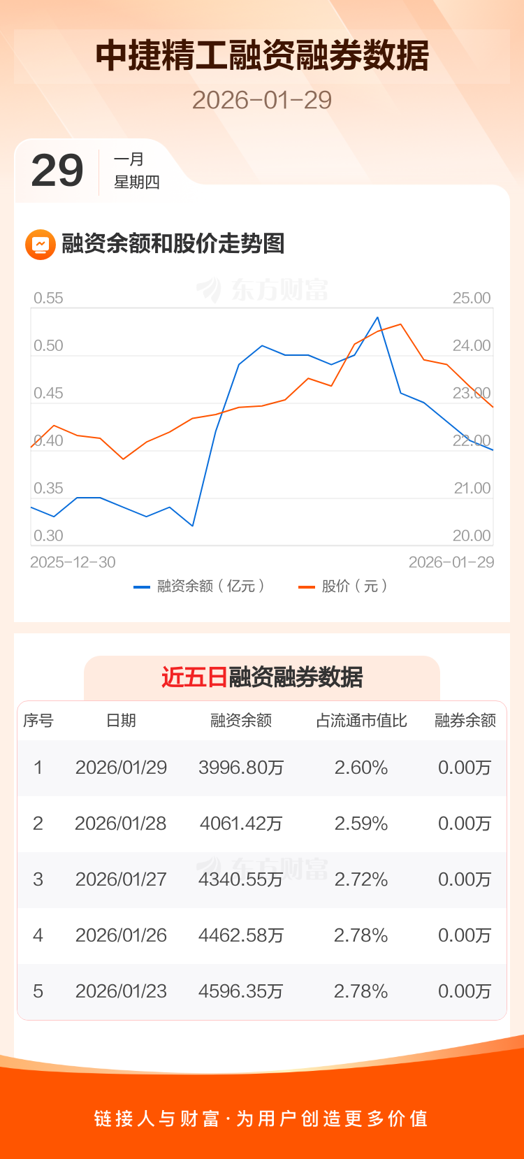 交易所最新数据显示,中捷精工于2026年1月29日获融资买入354.00万元,融资偿还418.62万元,当日融资净偿还64.62万元。目前,该股融资余额3996.80万,占流通市值比例为2.60%。