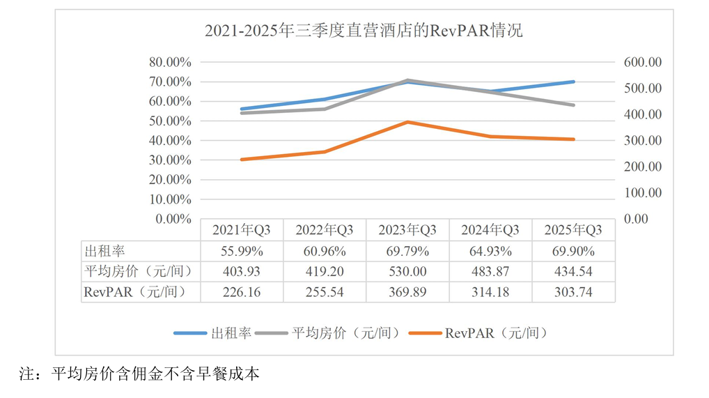 君亭酒店透露,2025年第三季度,集团旗下在营直营店RevPAR较去年同期下降3.32%,降幅较上半年有所收窄,其中平均房价同比下降至434.54元,是主要下行因素,出租率同比提升4.97%至69.90%,但未能完全抵消房价压力,呈现出“量升价跌”的特征。