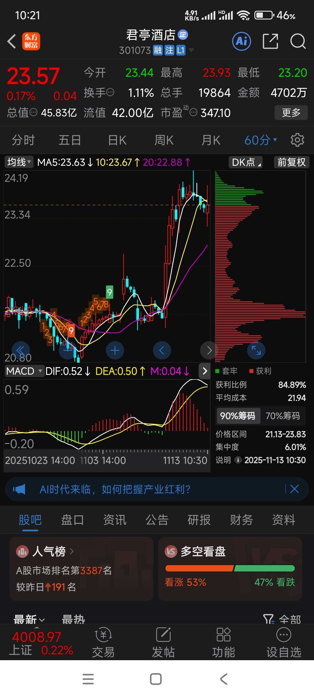 $君亭酒店(SZ301073)$ 60分钟顶背离