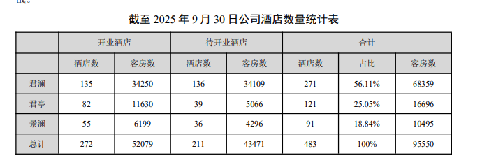截至今年9月30日,君亭酒店公司旗下君澜、君亭、景澜三大酒店品牌合计开业数量272家、客房数52079间。加上待开业项目,合计酒店总数达483家,客房总数超过95000间。