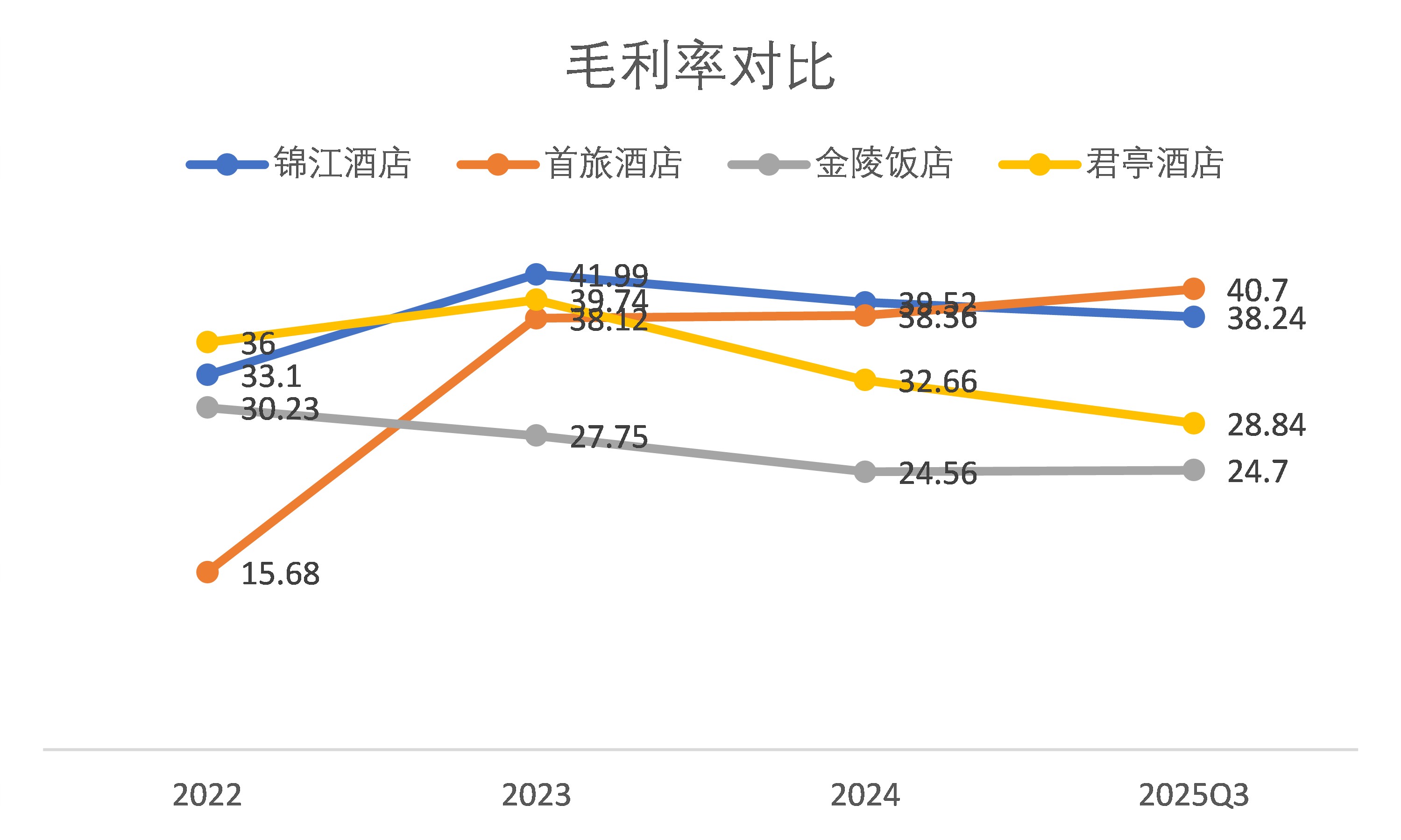 财报显示,君亭酒店的毛利率从2023年的39.74%降至2025年三季度的28.84%。与同行相比,锦江酒店和首旅酒店作为行业龙头,品牌力和会员体系更完善,毛利率仍在接近40%的水平。金陵饭店和君亭酒店的毛利率则普遍较头部企业低了约10个百分点。