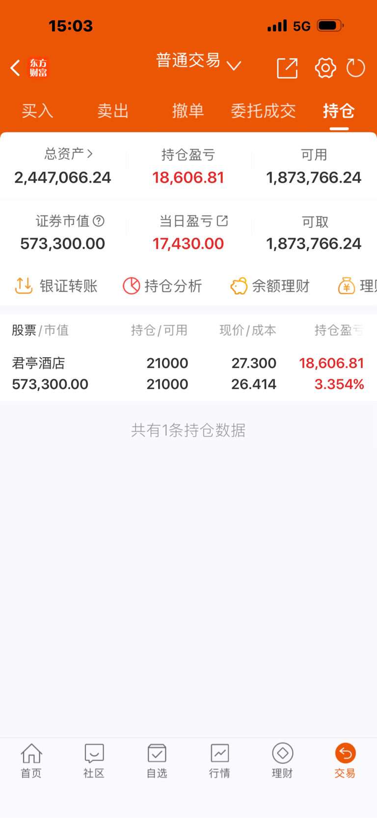 今日无操作:持有:君亭酒店