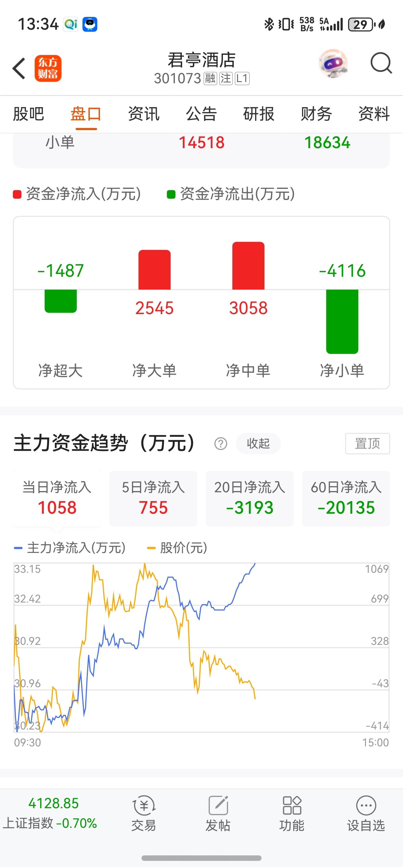 $君亭酒店(SZ301073)$ 你这就有意思了,主力资金流入这么多,你跳水。。。