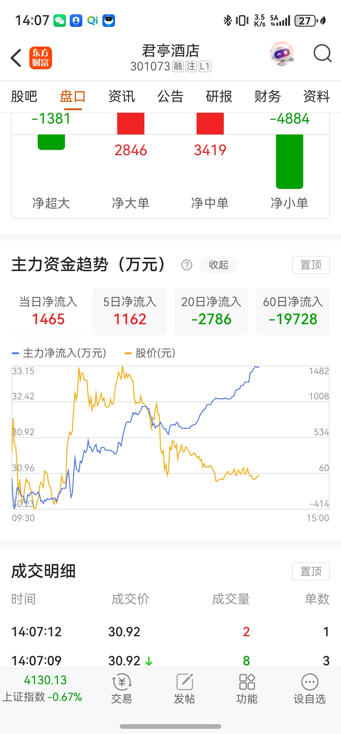 $君亭酒店(SZ301073)$ 大单买,小单卖???