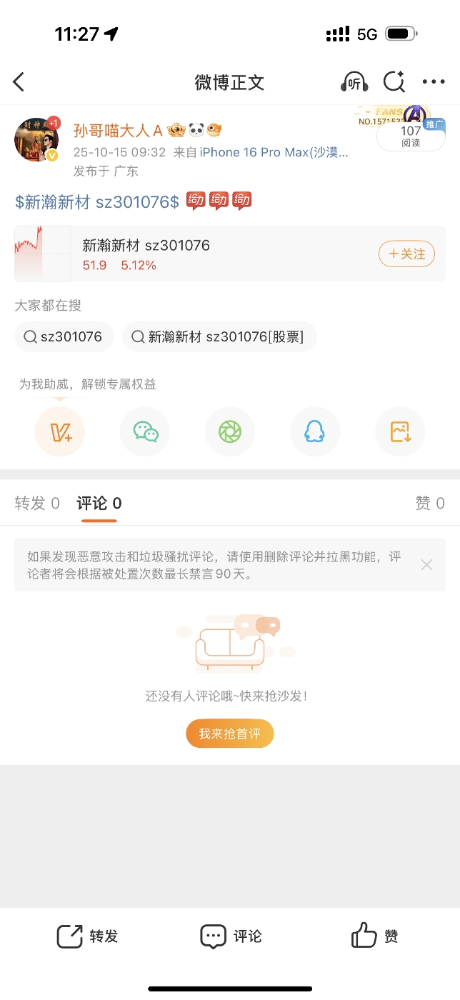 最近这两天小伙伴都在潜水了,孙哥更新的动力都不足了,在线的朋友出来点赞评论回帖发财,点赞超过100我们继续拿长腿!!$新瀚新材(SZ301076)$ $中洲特材(SZ300963)$ $金力永磁(SZ300748)$