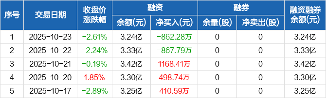 融资方面,当日融资买入2183.25万元,融资偿还3045.52万元,融资净偿还862.28万元。融券方面,融券卖出0股,融券偿还0股,融券余量0股,融券余额0元。融资融券余额合计3.24亿元。