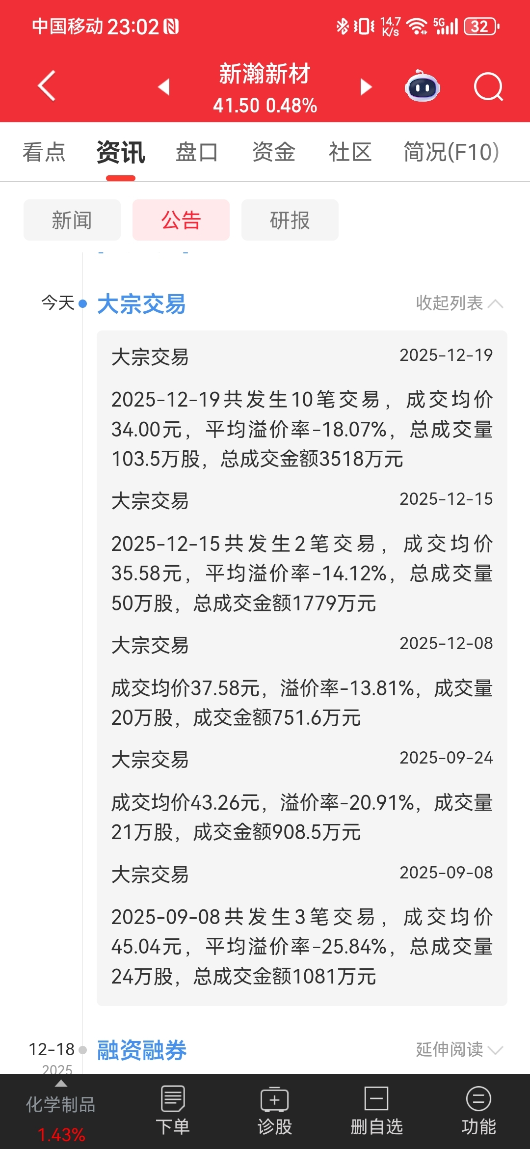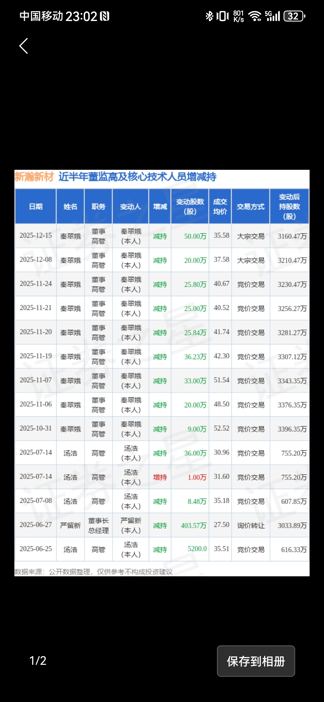 $新瀚新材(SZ301076)$ 终于减持完了,下周开启反弹。预期10—20%是有的,下周看到50元左右。竞价交易减持了175万股左右,今天减持105万左右大宗,加上前几天的20/50共70万股。减持就算完成了。从公布减持前64元到现在40出头,跌了三分之一左右,回到50左右是短期的事情。