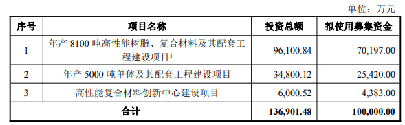 具体来看,年产8100吨高性能树脂、复合材料及其配套工程建设项目为本次募投的重点项目,总投资金额为9.61亿元,拟使用募集资金投入金额为7.02亿元。