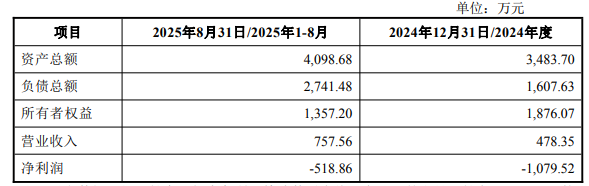记者注意到,海瑞特2024年营收仅478.35万元,净亏损却高达1079.52万元;2025年前8月,其营收增至757.56万元,但仍亏损518.86万元。公司所有者权益自2024年末的1876万元缩水至2025年8月末的1357万元。