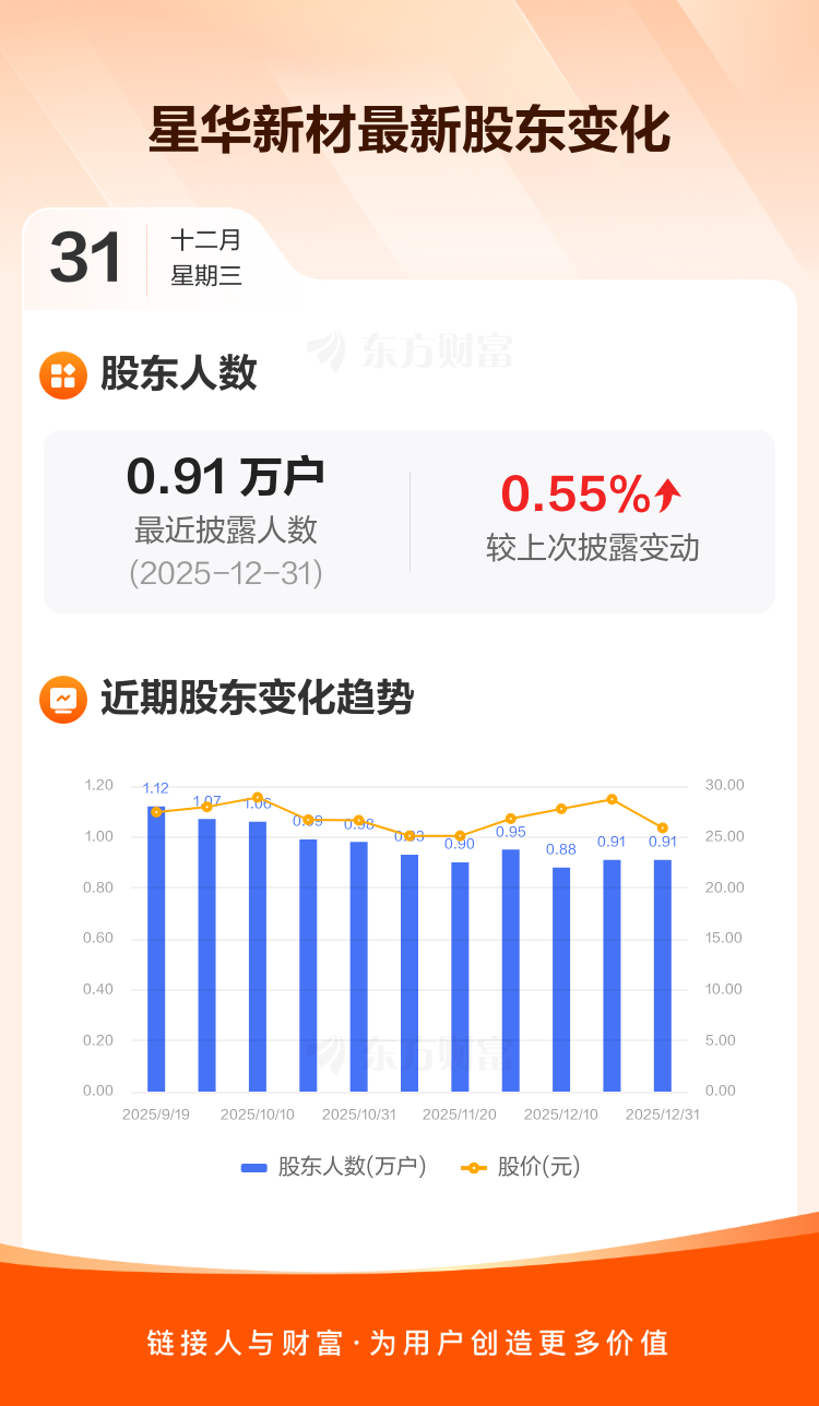 星华新材最新披露数据显示,截至12月31日公司股东户数为9139户,较上期(2025年12月19日)增加50户,增幅为0.55%。户均持有流通股数量由上期的1.05万股下降至1.04万股,户均持股金额由上期的30.10万元减少至27.02万元。