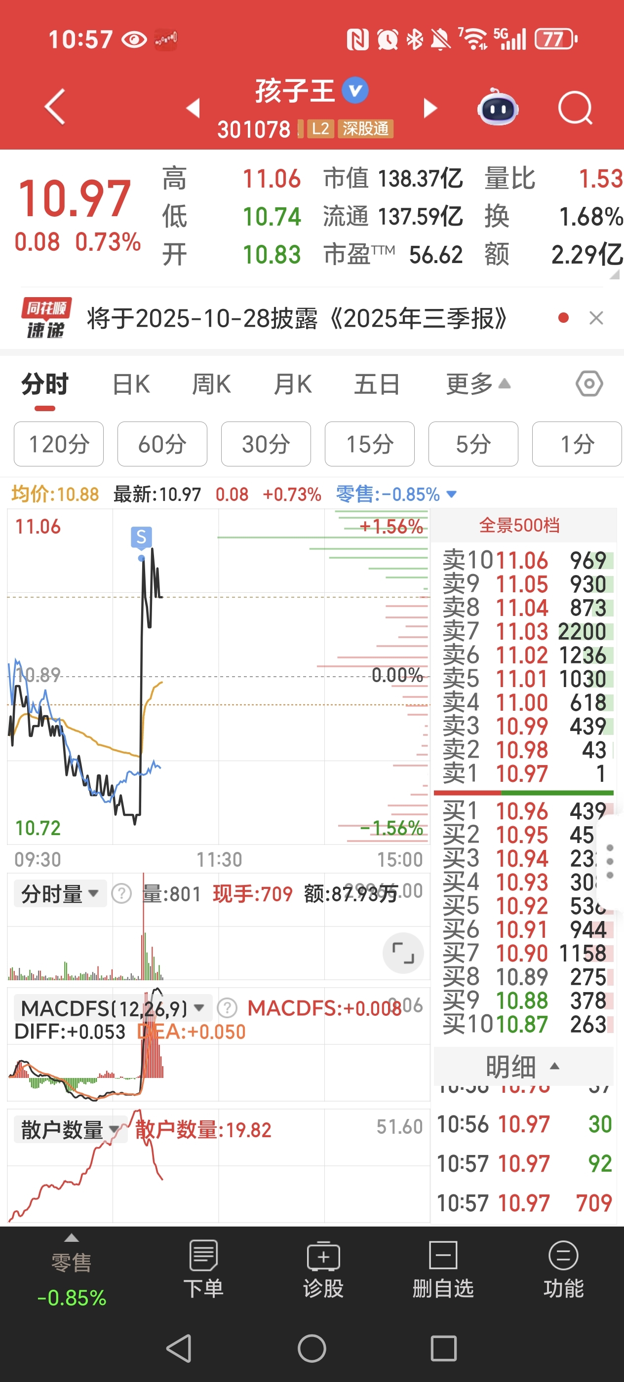 $孩子王(SZ301078)$ 与其天天吧里骂,不如学学技术或者挖掘别的好股,怨气那么大心态不好是赚不到钱的,今天11.1再挂单一笔昨天低位进的仓位,看能不能继续冲吧