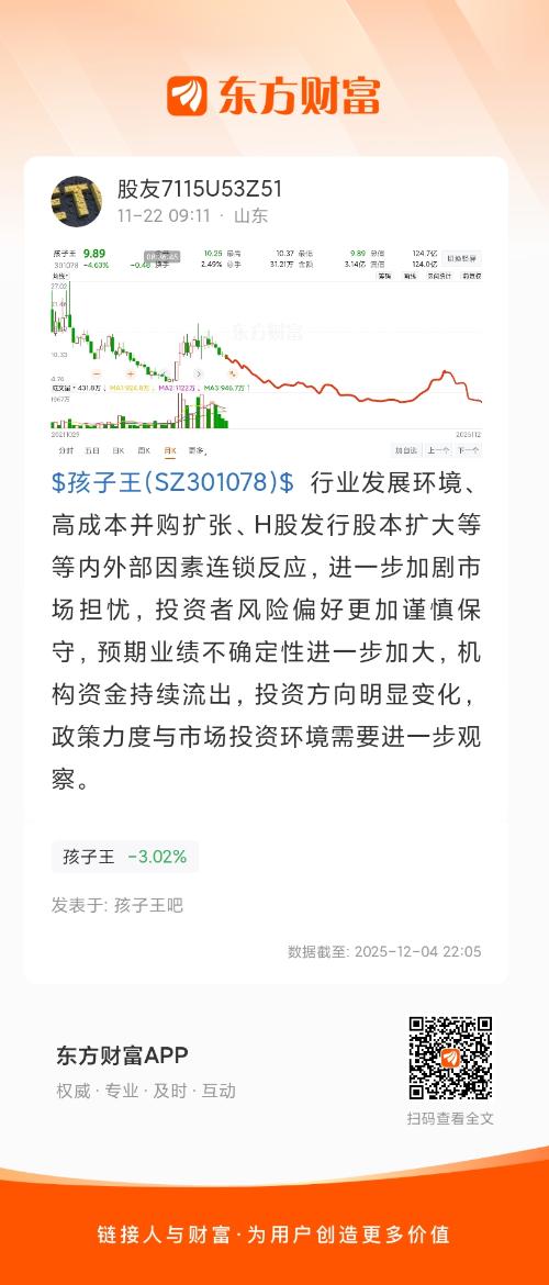 $孩子王(SZ301078)$ 行业发展环境、高成本并购扩张、H股发行股本扩大等等内外部因素连锁反应,进一步加剧市场担忧,投资者风险偏好更加谨慎保守,预期业绩不确定性进一步加大,机构资金持续流出,投资方向明显变化,政策力度与市场投资环境需要进一步观察。