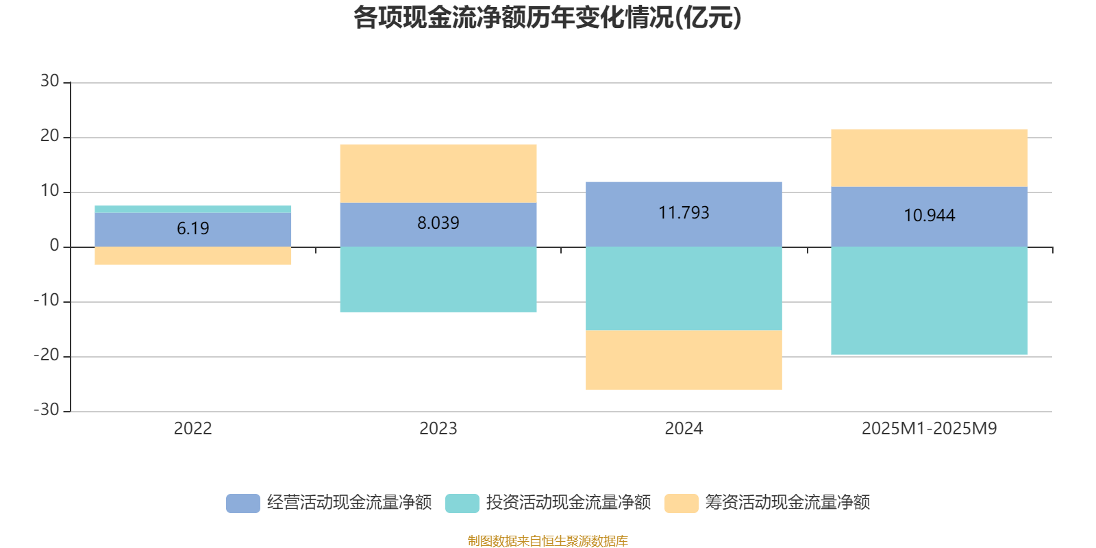 2025年1月至9月,公司经营活动现金流净额为10.94亿元,同比增长20.44%;筹资活动现金流净额10.46亿元,同比增加15.95亿元;投资活动现金流净额-19.71亿元,上年同期为-18.2亿元。