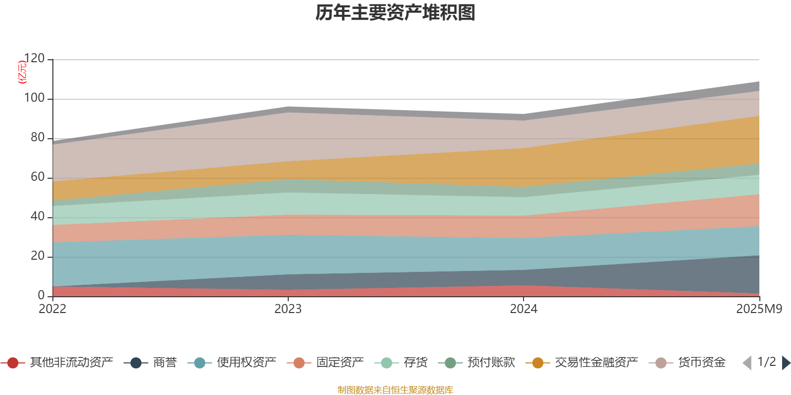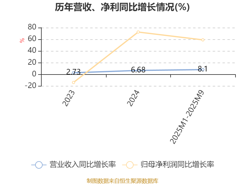 资产重大变化方面,截至2025年9月,公司商誉较上期末增加147.05%,占公司总资产比重上升9.28个百分点;其他非流动资产较上期末减少74.49%,占公司总资产比重下降4.67个百分点;使用权资产较上期末减少8.67%,占公司总资产比重下降3.95个百分点;货币资金较上期末减少9.73%,占公司总资产比重下降3.55个百分点。