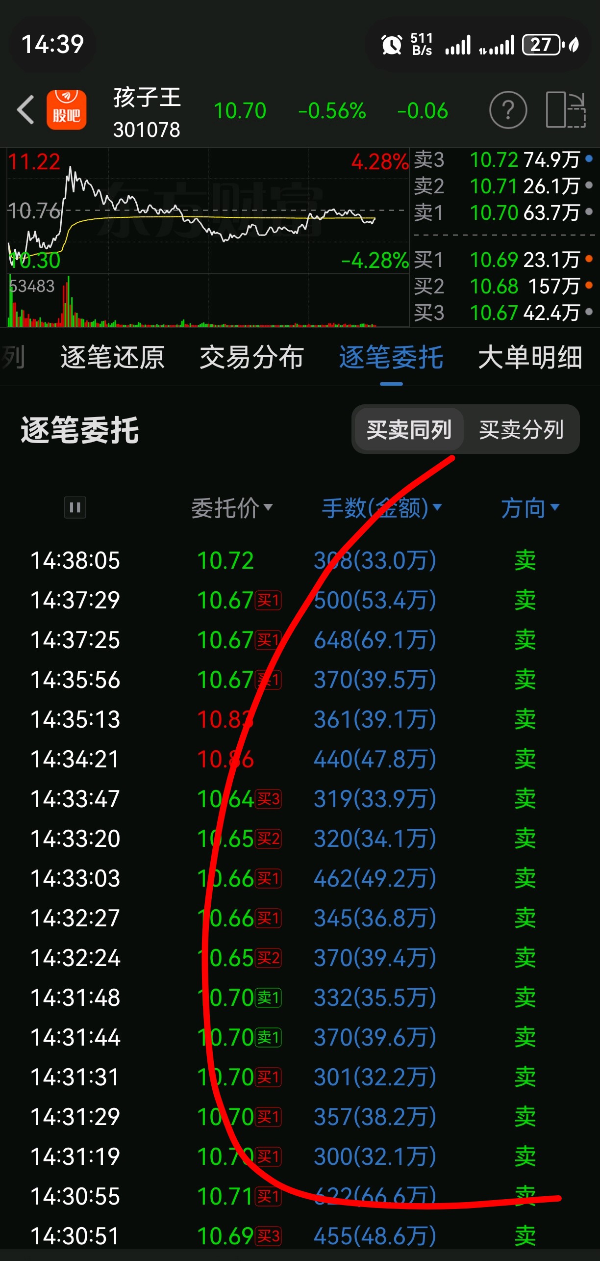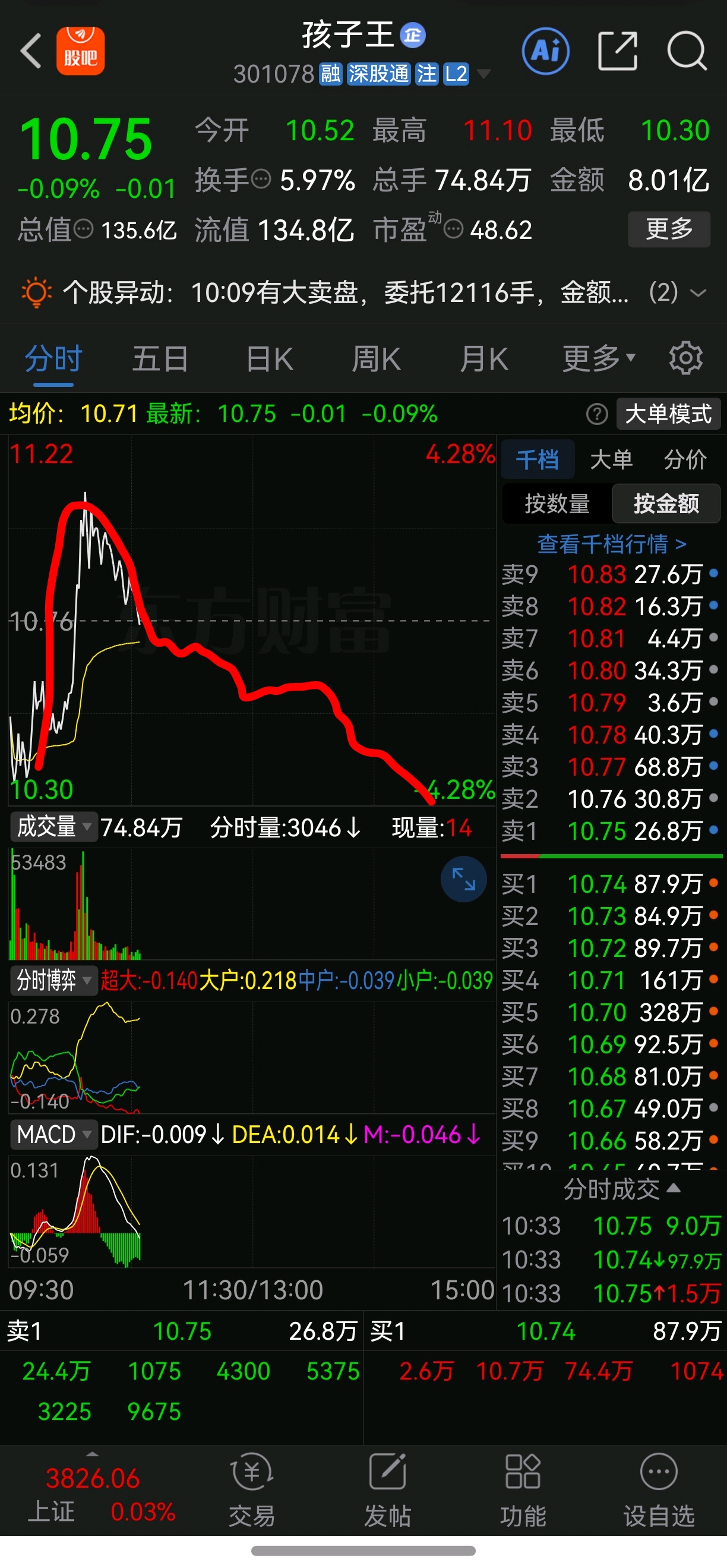 讲再多故事没用,是不是忽悠投资者,大资金很清楚,下午大盘可是放量大阳线,$孩子王(SZ301078)$的大资金都是在买盘位抢着卖,这就是态度,股价在底部都是套牢盘不存在洗盘,配合当下大盘,这资金和走势,纯纯的不看好。