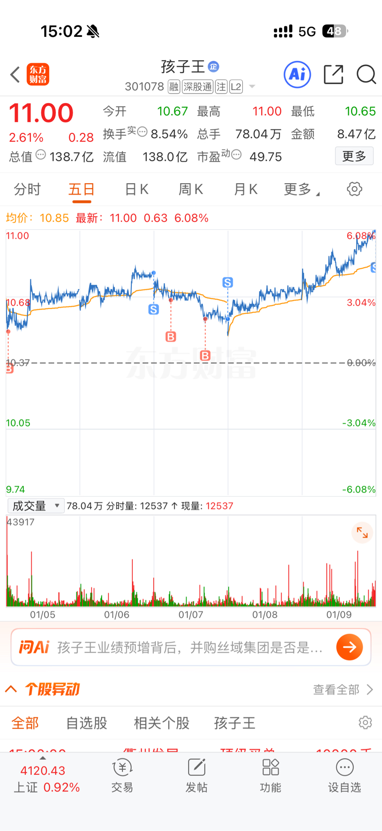 $孩子王(SZ301078)$ 这周做了三个隔日T,还好大盘强势,硬拉上去,有2个赚了