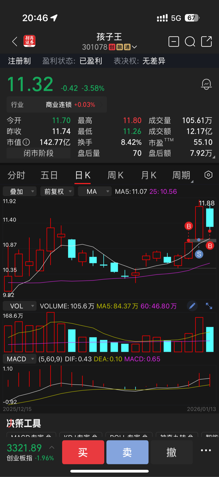 $孩子王(SZ301078)$ 昨天卖了留了500,尾盘1130又进了