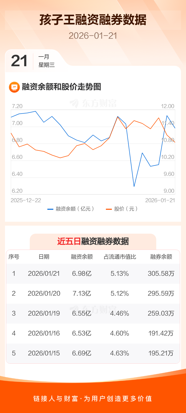 交易所最新数据显示,孩子王于2026年1月21日获融资买入6071.67万元,融资偿还7599.60万元,当日融资净偿还1527.94万元。目前,该股融资余额6.98亿,占流通市值比例为5.13%。