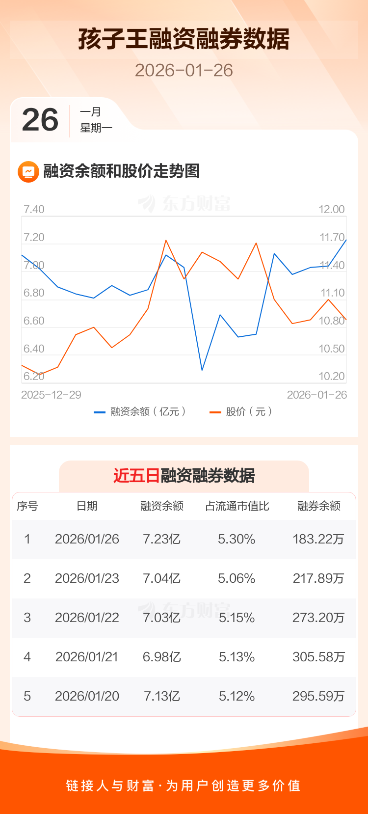 交易所最新数据显示,孩子王于2026年1月26日获融资买入8982.91万元,融资偿还7090.82万元,当日融资净买入1892.09万元。目前,该股融资余额7.23亿,占流通市值比例为5.30%。