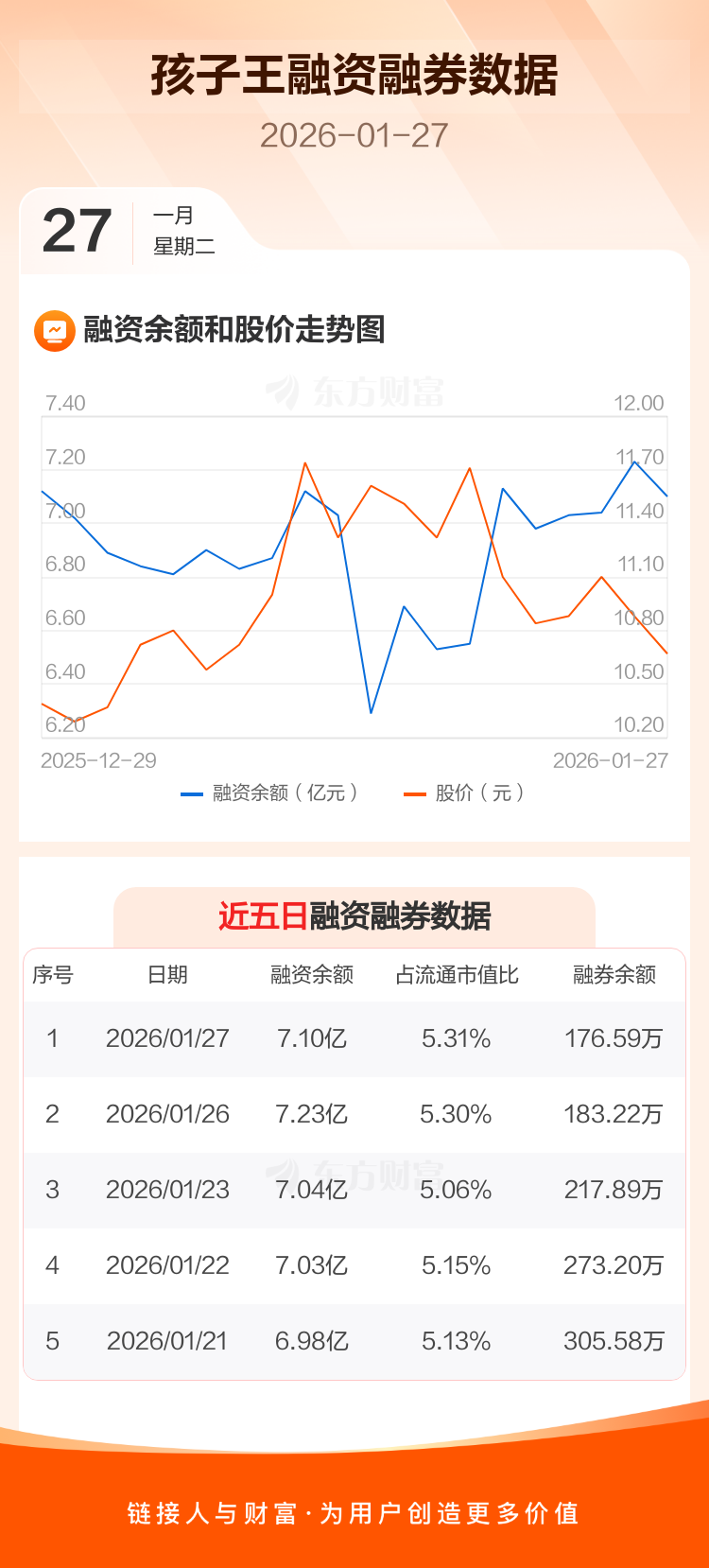 交易所最新数据显示,孩子王于2026年1月27日获融资买入5238.24万元,融资偿还6547.81万元,当日融资净偿还1309.57万元。目前,该股融资余额7.10亿,占流通市值比例为5.31%。