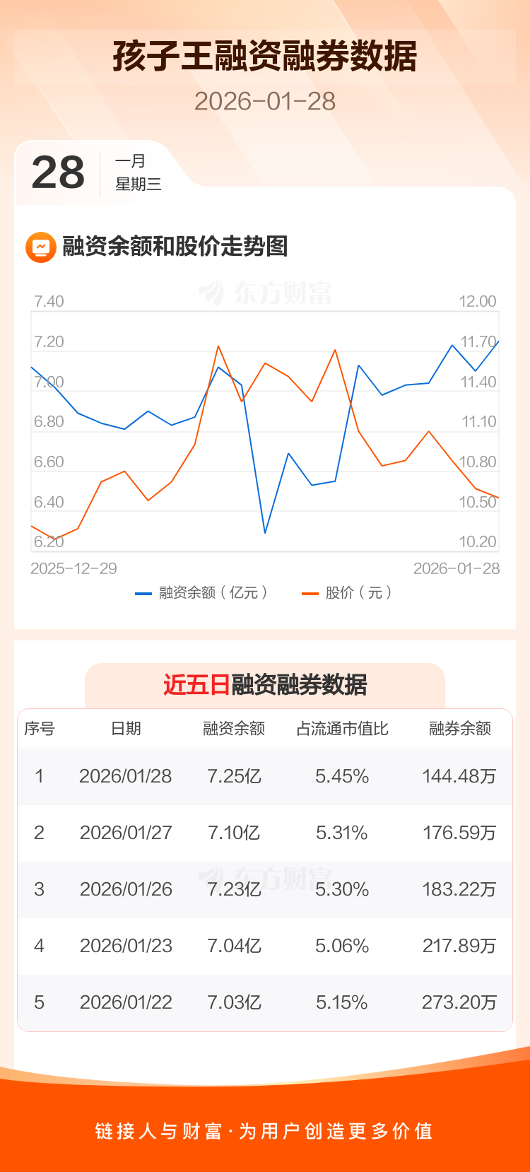 交易所最新数据显示,孩子王于2026年1月28日获融资买入4768.95万元,融资偿还3288.40万元,当日融资净买入1480.55万元。目前,该股融资余额7.25亿,占流通市值比例为5.45%。