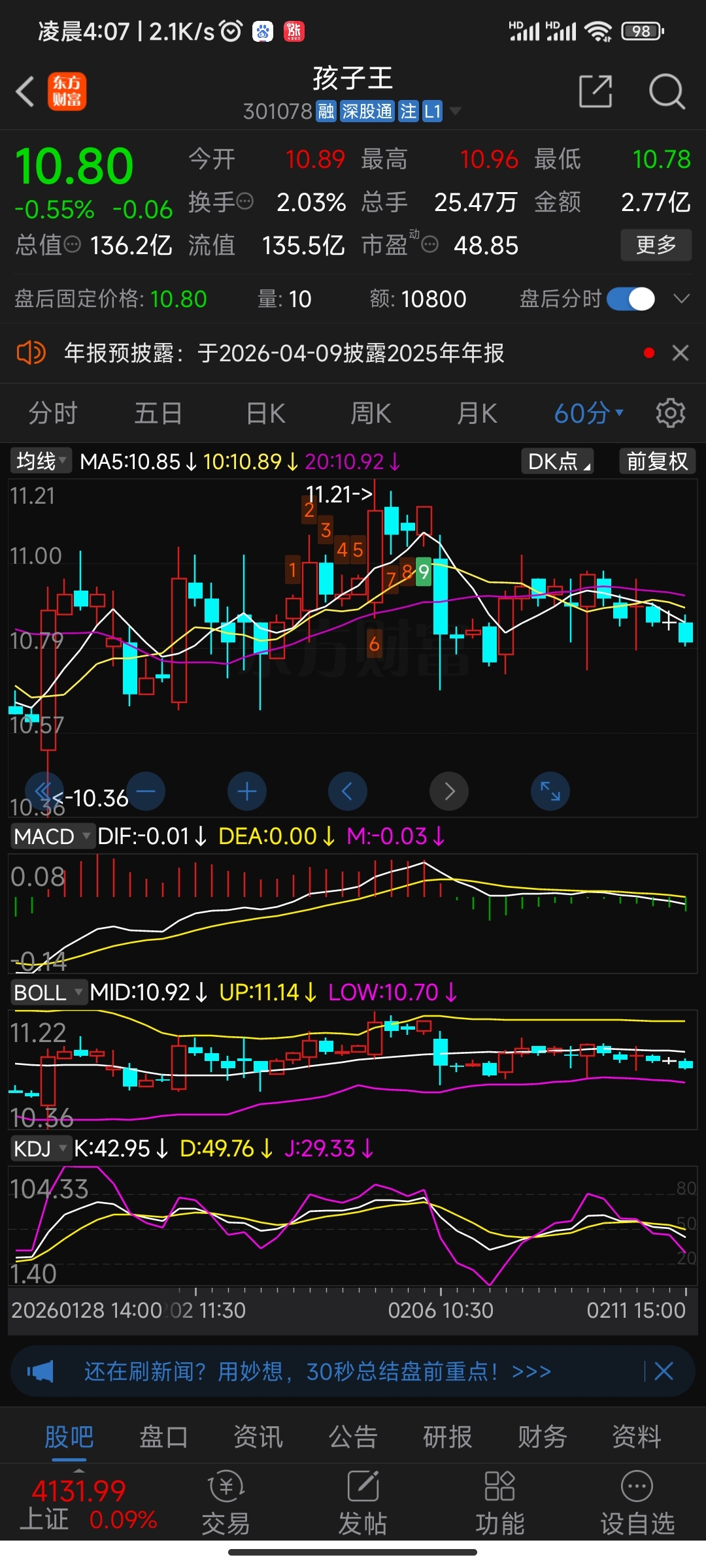 $孩子王(SZ301078)$ 从技术面分析,短期趋势走坏了,做长线的无所谓,做短线的月底前不用看了,均线粘合,60分钟又是死叉,股价不打到10元附近不会反弹。