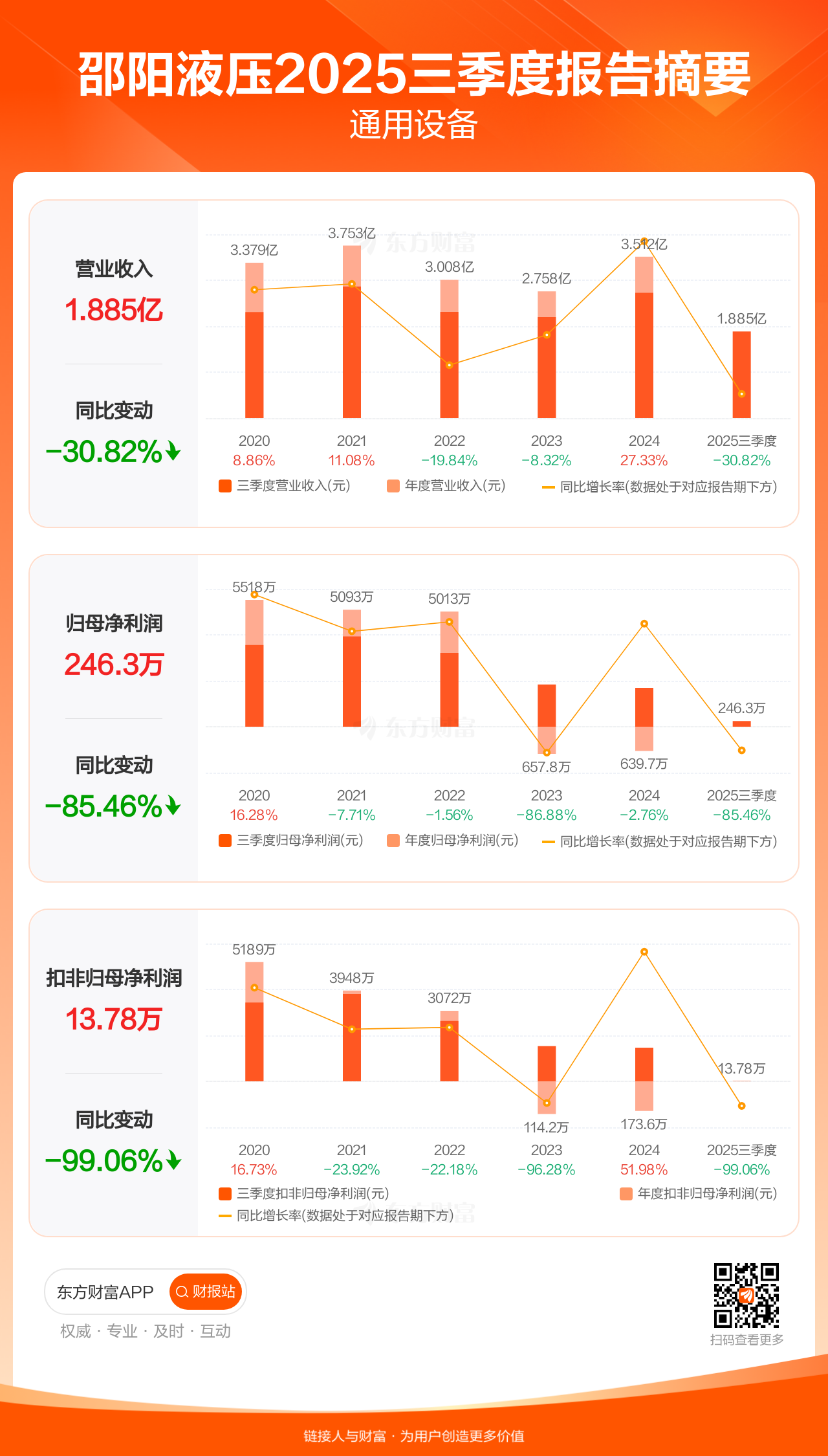 邵阳液压10月29日发布2025年三季报显示,公司前三季实现营业收入1.89亿元,同比下滑30.82%;归母净利润246.28万元,同比下滑85.46%;扣非归母净利润13.78万元,同比下滑99.06%。
