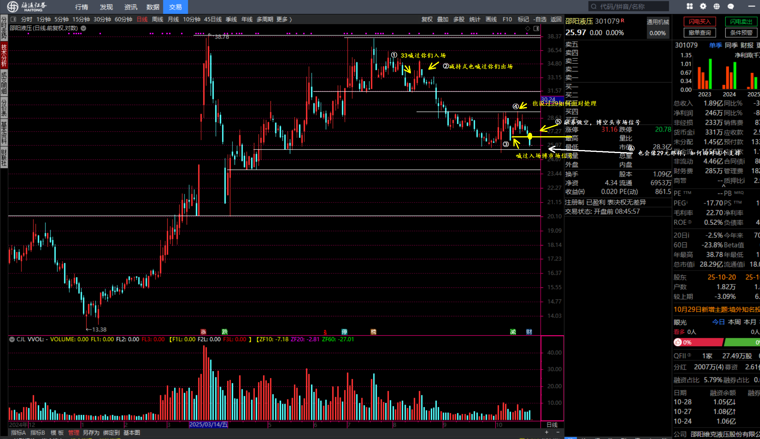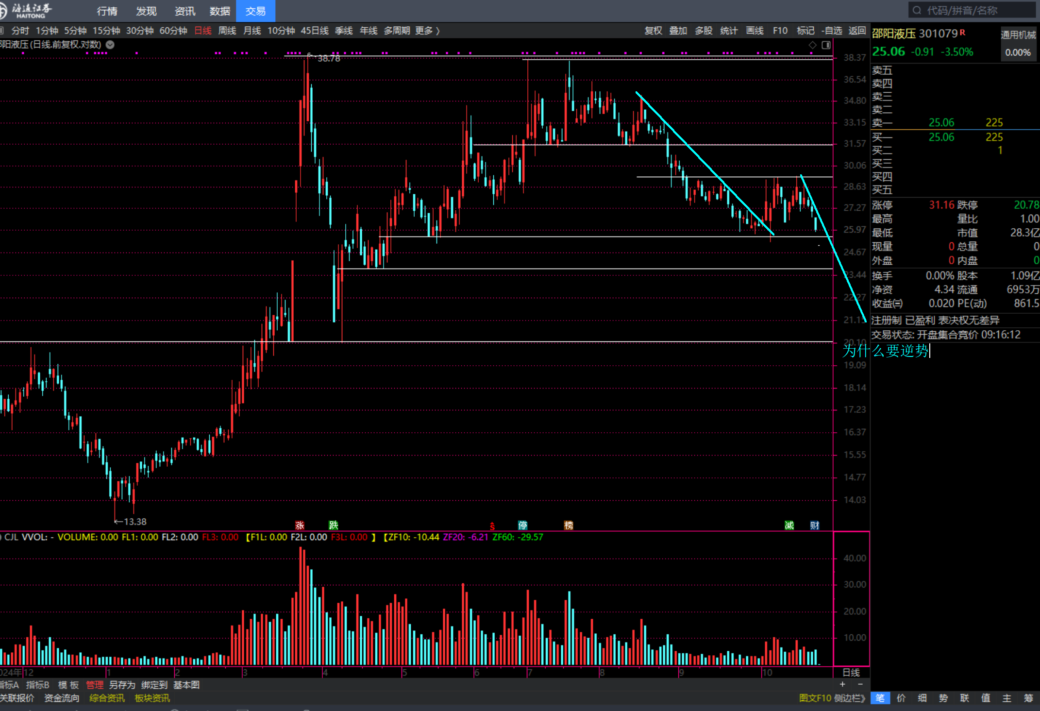 我也要尊重市场;就好像我希望:钻杆行情时,29.30直接突破形成市场信号。但是市场上的要砸,我也只能顺应他们。 反之,我希望25.25砸穿,但是市场上也有会去低吸。