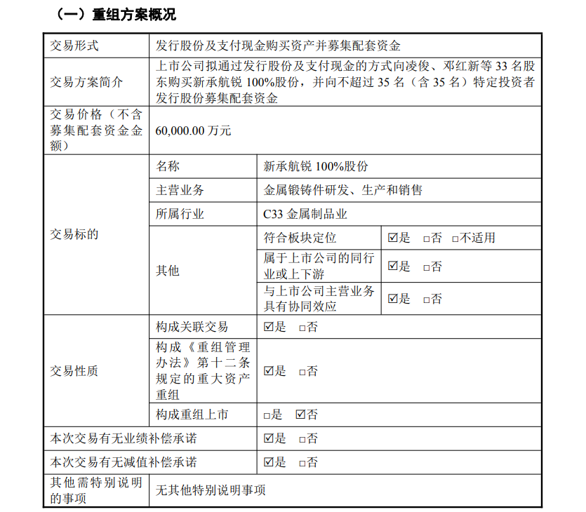 12月10日,邵阳液压(301079)披露重大重组方案,公司拟通过发行股份及支付现金的方式购买凌俊、邓红新等33名交易对方持有的重庆新承航锐科技股份有限公司100%股份。