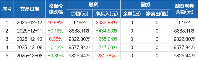 融资方面,当日融资买入7213.65万元,融资偿还4176.77万元,融资净买入3036.88万元,净买入额创历史新高。融券方面,融券卖出0股,融券偿还0股,融券余量0股,融券余额0元。融资融券余额合计1.19亿元。