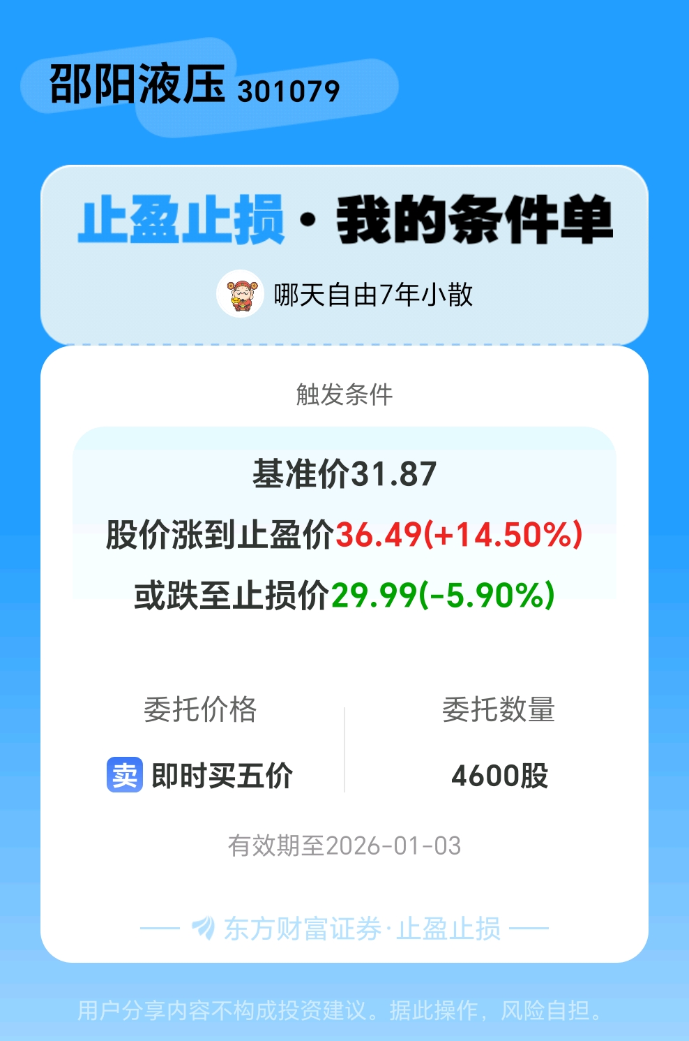#条件单交流# #止盈止损晒单# 一位股神设置了一个止盈止损条件单,接下来就是见证奇迹的时刻~$邵阳液压(SZ301079)$