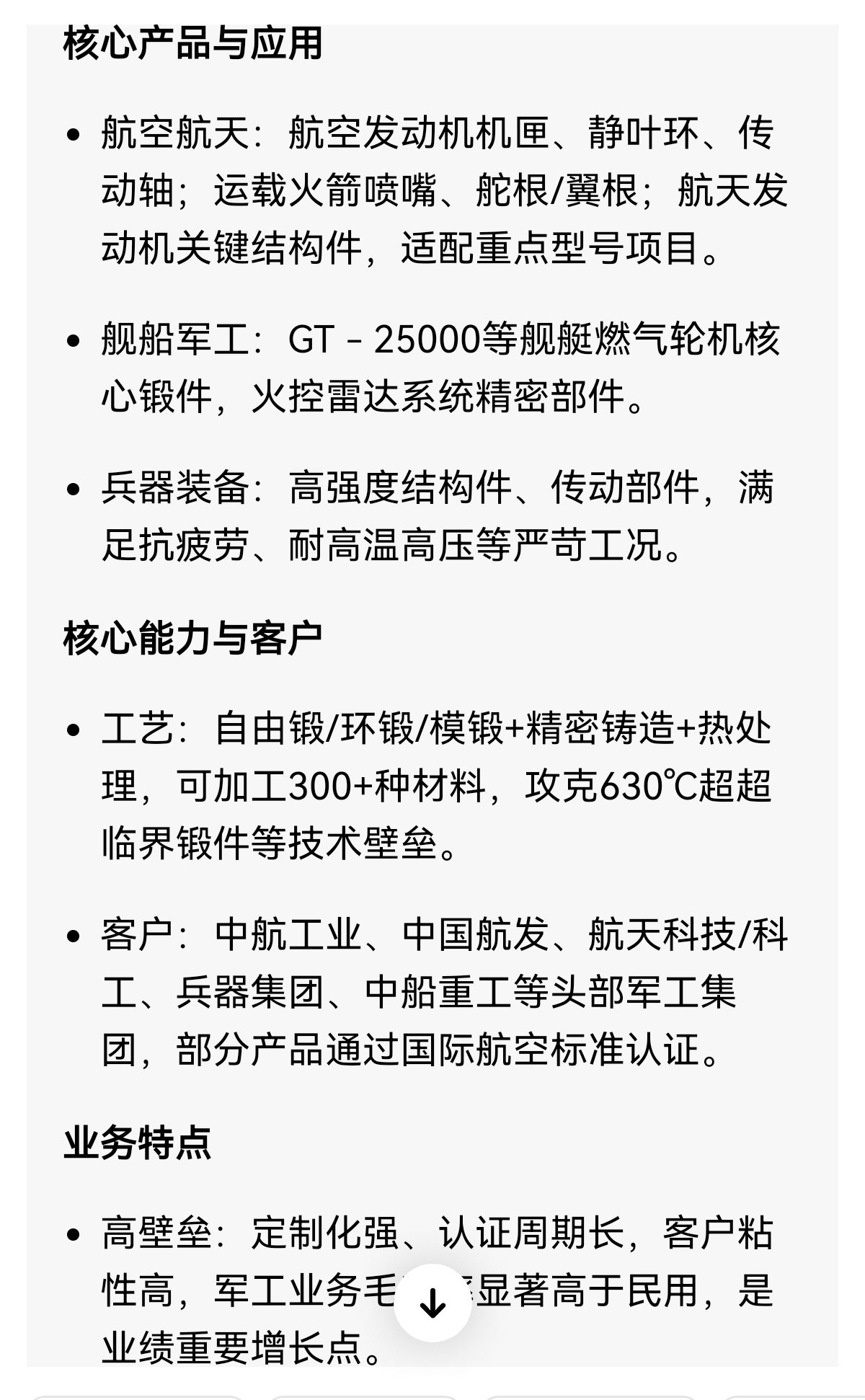 $邵阳液压(SZ301079)$ 新承航锐军品方面主要做舰艇燃气轮机核心锻件,火控雷达系统精密部件等,除了航天有火箭回收装置,军工方面也很强