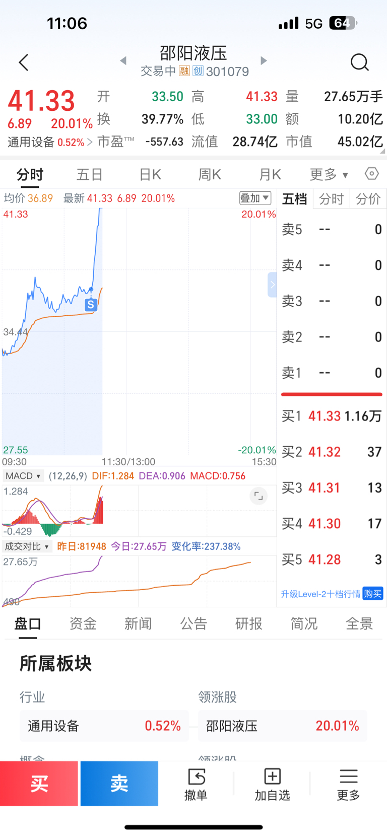 $邵阳液压(SZ301079)$ 靠 ,36.96没撤单,收了我的码就起飞