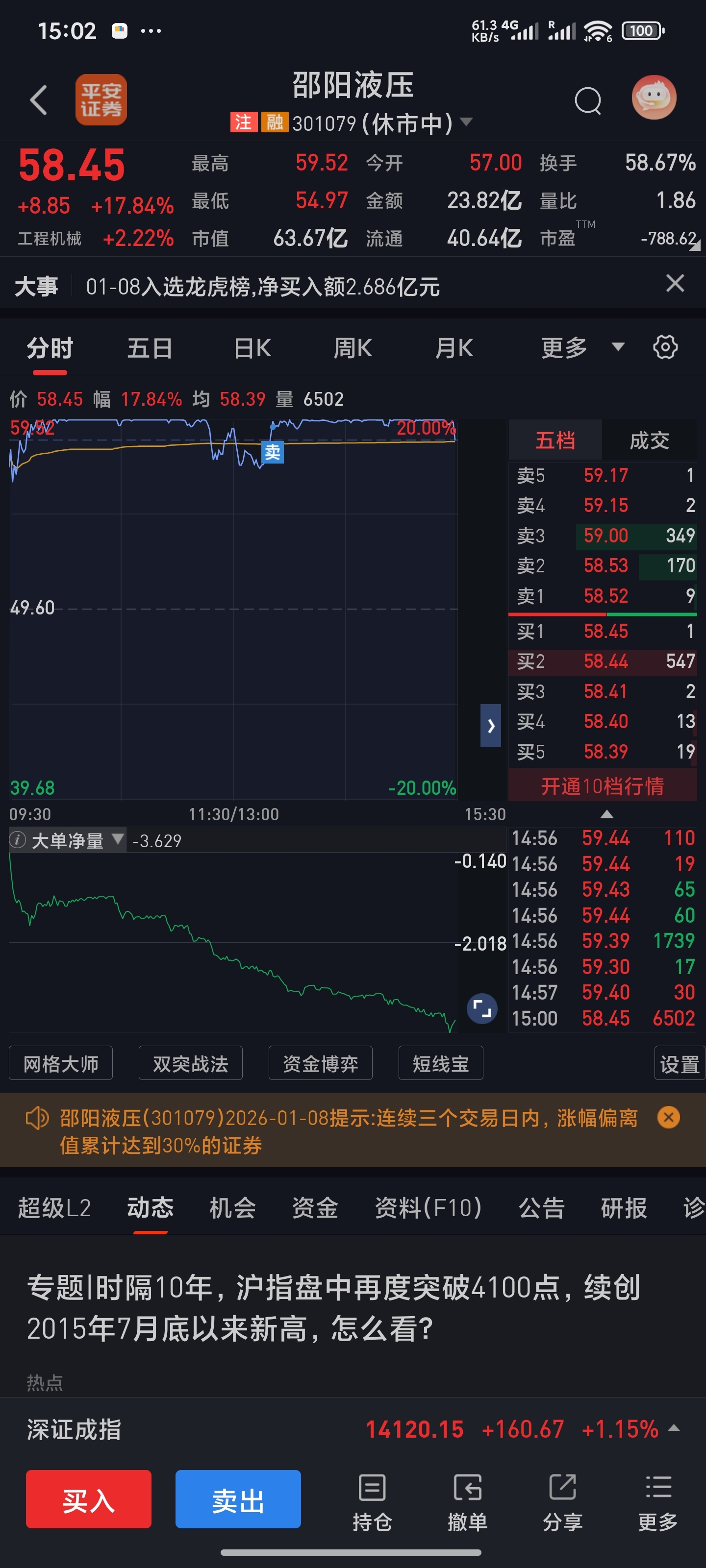 $邵阳液压(SZ301079)$ 一个信用加主帐户都清了,感谢主力,格局到下午真的不容易了,兄弟们最后没封到板,估计就有点难了,希望周一板块强势,继续弱转强吧,买低位的德恩精工和太力利技了。感谢主力的开年红包!