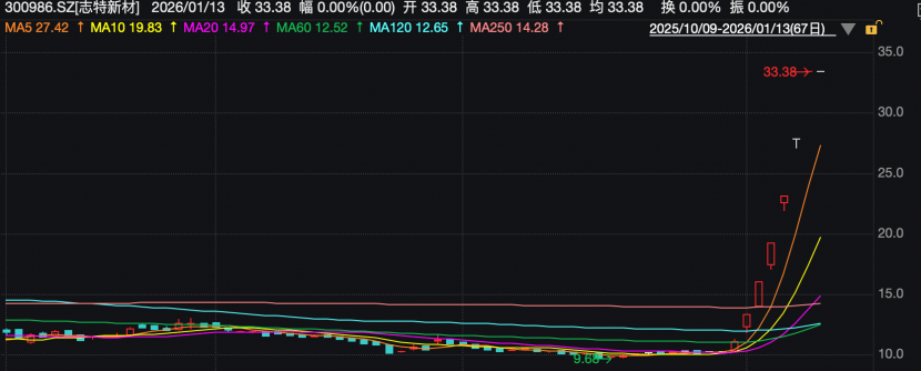 值得注意的是,志特新材是2026年以来A股市场首只翻倍股,1月12日其股价最高至33.38元,较2025年底的收盘价涨幅接近200%。