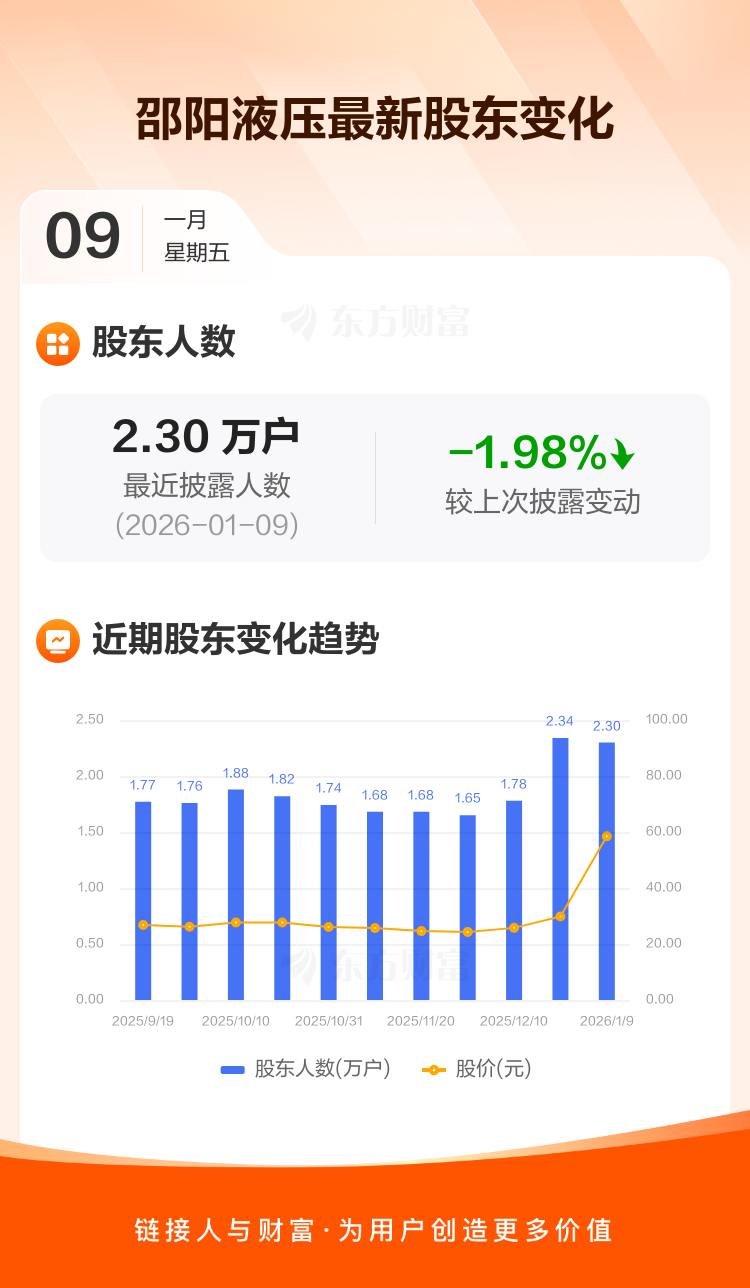邵阳液压:截至1月9日最新股东户数2.30万户,较上期减少1.98%