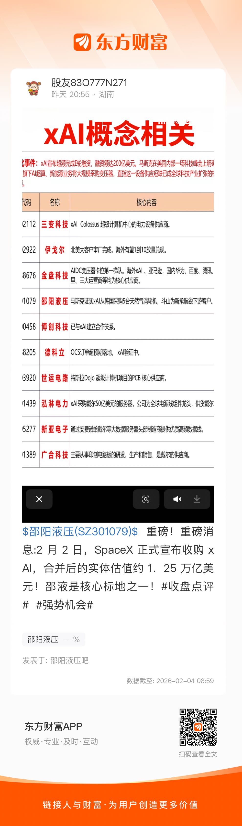 $邵阳液压(SZ301079)$ 重磅!重磅消息:2 月 2 日,SpaceX 正式宣布收购 xAI,合并后的实体估值约 1.25 万亿美元!邵液是核心标地之一!#收盘点评# #强势机会#