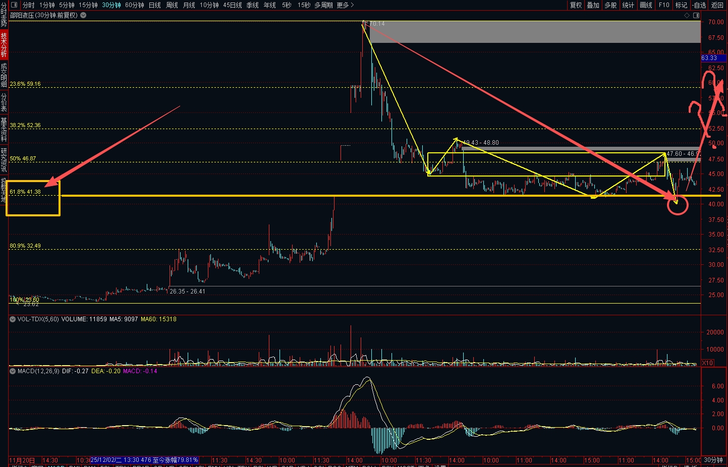 $邵阳液压(SZ301079)$ 关于邵阳液压的技术分析,第一个黄金分割位0.618也就是41.38有强支撑,股价也是从70跌到这个位置止跌横盘。30分钟级别的中枢已经完美,出了新低,有了背驰。后面怎么走,明天走出来就知道了