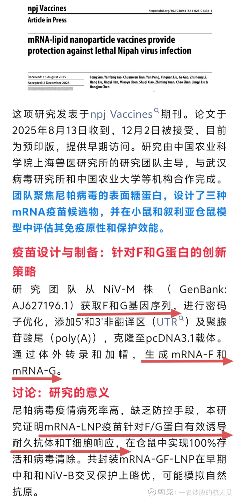 $百普赛斯(SZ301080)$ 国内首个尼帕病毒mrna疫苗研究,F蛋白和G蛋白就是百普赛斯的产品,国内唯一供应商,比那些检测试剂,不对症的流感疫苗正多了