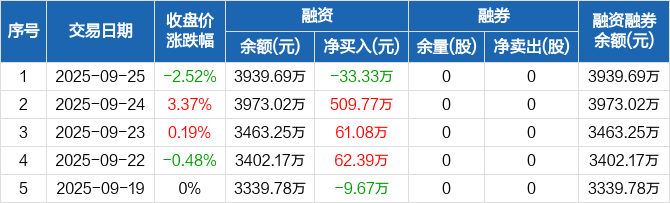 严牌股份:融资净偿还33.33万元,融资余额3939.69万元(09-25)