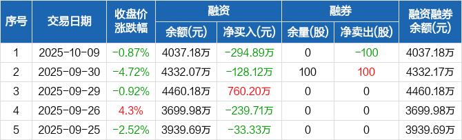 严牌股份:融资净偿还294.89万元,融资余额4037.18万元(10-09)